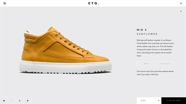 产品,是为自己说话的,ETQ也让他们的鞋子比他们的UI。网站是相当少的风格,延伸到配色方案。他们把重点商品。虽然他们的鞋子都是五彩缤纷的,但是在示例中它仍然是很长一段路要走,要让鞋子的颜色是最大的课程设计。它真正让鞋脱颖而出。